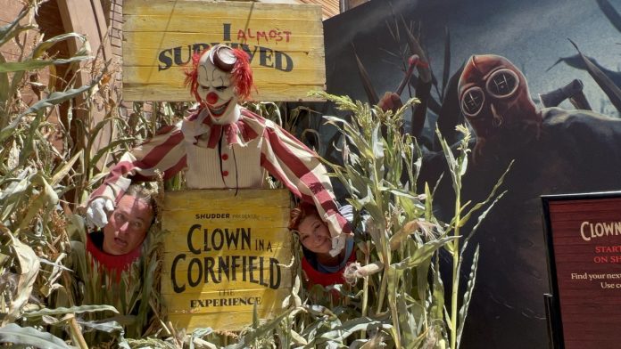 Clown in a Cornfield, the terrifying slasher film based on the book by Adam Cesare, is set to make its’ streaming debut on Shudder and AMC+ on August 8th, and Shudder, which is celebrating its 10th year as the go-to streamer for classic and new horror film and television, marked the occasion by bringing a terrific Clown in a Cornfield offsite activation to San Diego Comic Con.